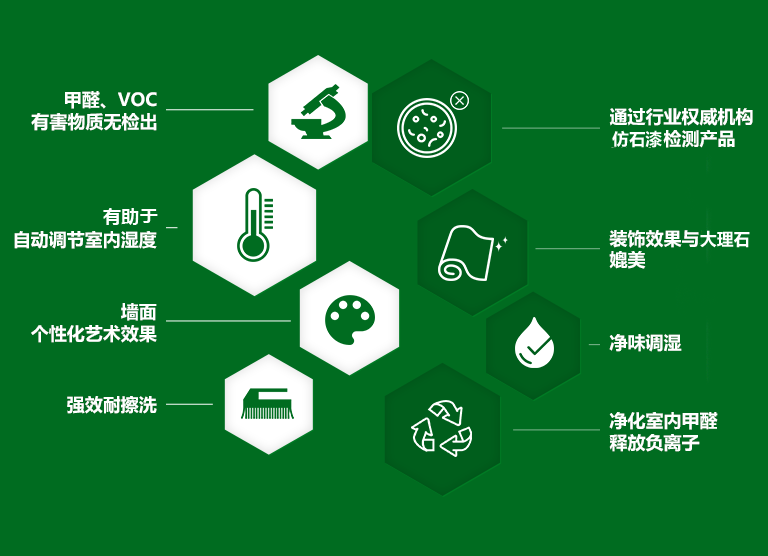 引進德國生產技術,采用歐洲環(huán)保標準,水性漿料制作而成,無任何有害物質釋放,施工完成當天入住。防霉